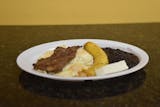 Grilled beef, pork stripe, fried egg & fried plantain.